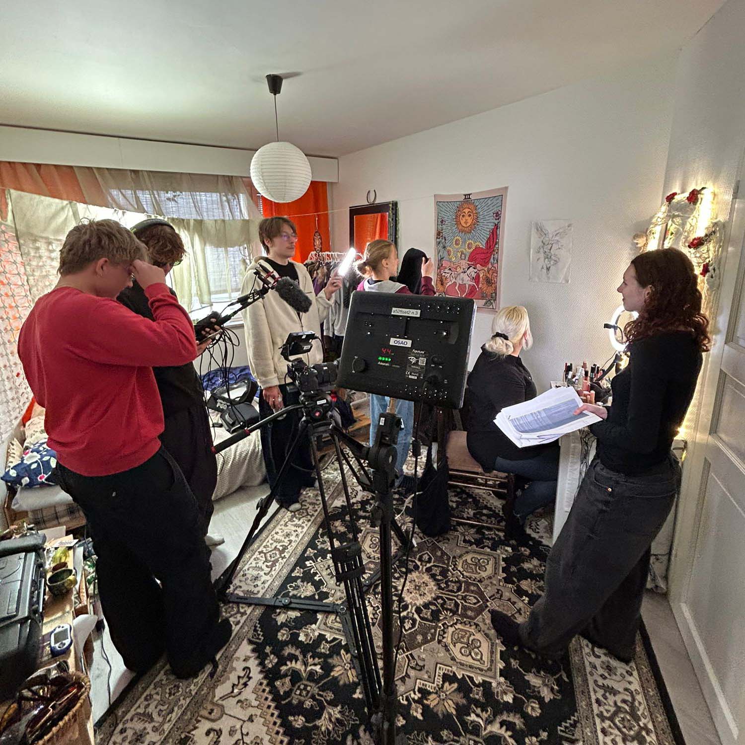 The production of the film started with choosing the script which we had three of. With the help of teachers we ended up choosing ”Mama skal noget viktigt” (also known as ”Business Mama”) as it was the most doable. After assigning the roles and work tasks we started searching for suitable actors and a place where to shoot the film at.