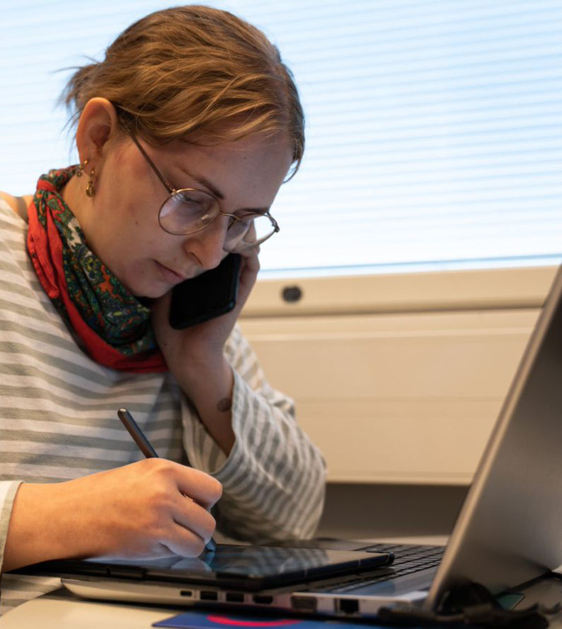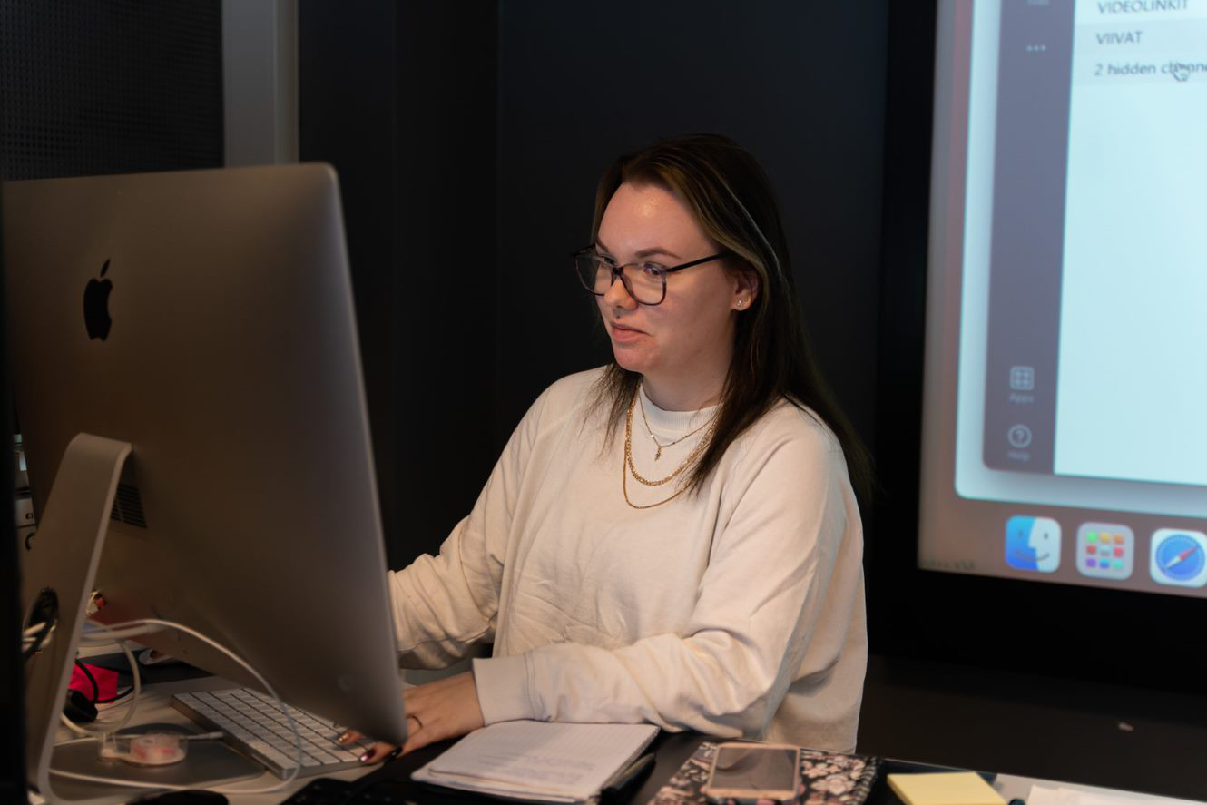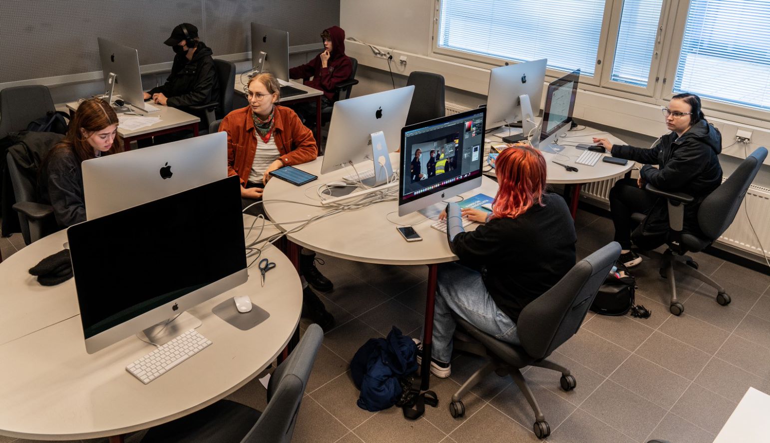 Koululle jäävän työryhmän toimintaa organisoi media-alan opiskelija Mitra Koskela. Toisessa kuvassa toimittajatiimi työn teossa.