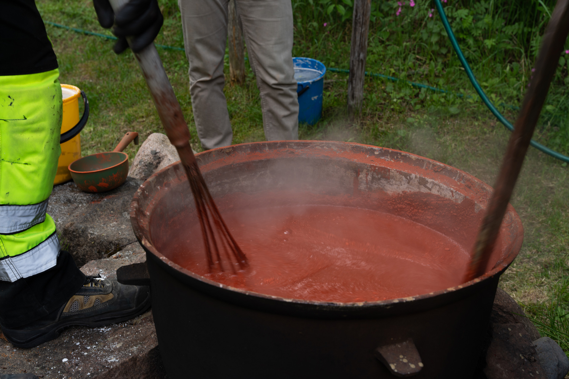 Palasimme takaisin keittopisteelle, jossa jo valmistauduttiin seuraavaan vaiheeseen. Vernissan lisäyksen jälkeen keittoon sekoitettiin punamulta. Oli jotenkin miellyttävää katsoa, kun tylsänvärinen keitto muuttui vähitellen punaiseksi. Keiton piti antaa hautua vielä hetki, joten kuvasimme taas lisää kuvituskuvaa, ja istahdimme hetkeksi alas. Oli kuuma päivä ja nestehukka alkoi jo tuntua, pitäisi kiinnittää enemmän huomiota veden juontiin! Onneksi Anu saapui paikalle ja tarjosi meille pillimehut.