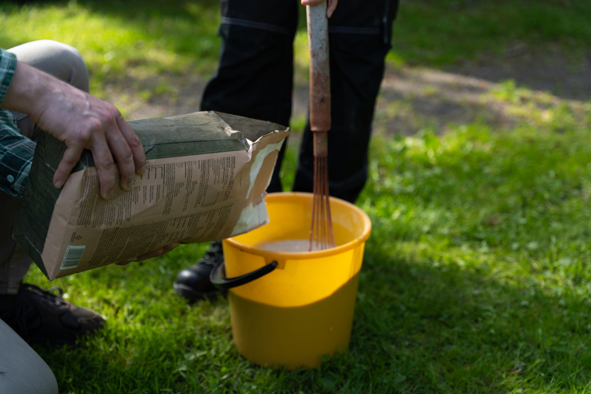 Raaka-aineiden kuvauksen jälkeen maalinkeittäjät alkoivat itse maalinkeittoon. Ensiksi sekoitettiin ruisjauhot veteen erillisessä ämpärissä. Minä kuvasin videota kameralla, ja Mitra otti valokuvia. Heti ruisjauhojen sekoituksen jälkeen pataan lisättiin rautasulfaatti, sitten ruisjauhot. Seos näytti ihan kaurapuurolta, mutta ei mitenkään herkulliselta. Keiton piti nyt kiehua 2 tuntia, joten pidimme Mitran kanssa ruoka tauon.