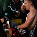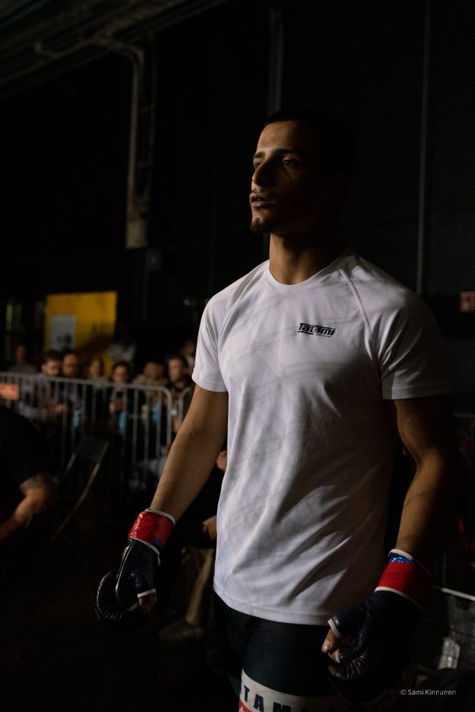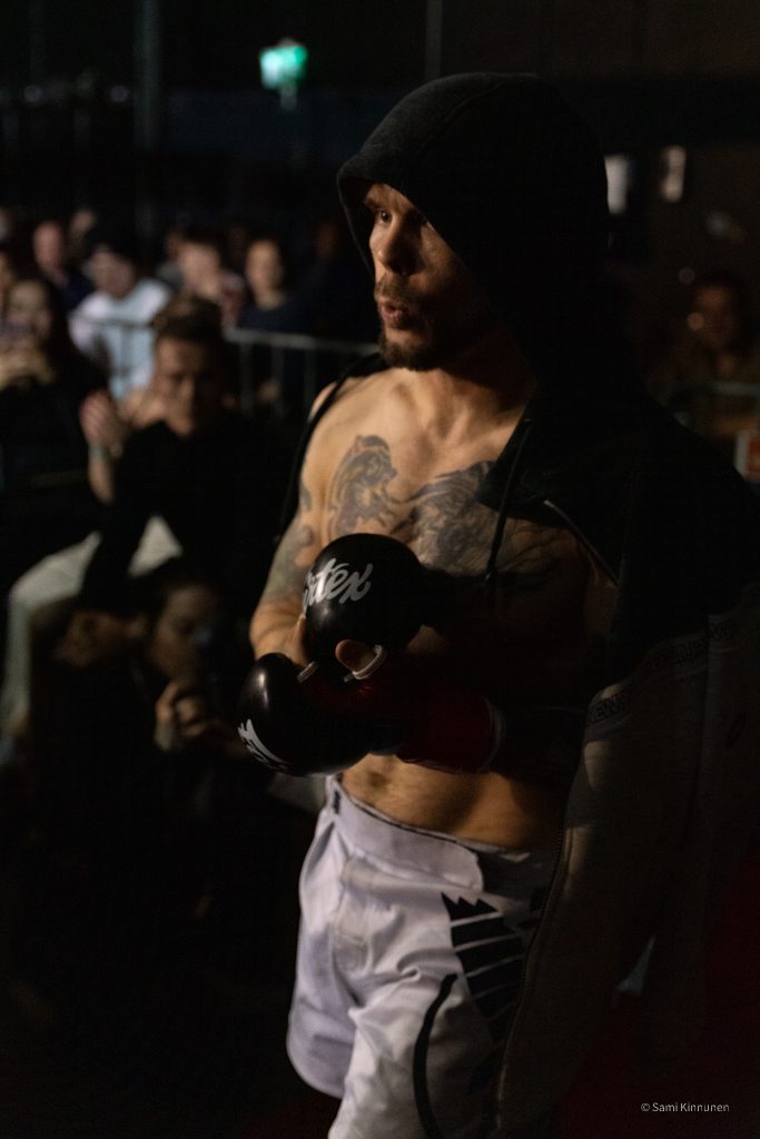 Ovet aukesivat kello 19.00 ja nimeni löytyi sovitusti listalta joten sisäänpääsyn kanssa ei ollut ongelmaa. Menin paikalle tietysti hyvissä ajoin jotta ehdin laittaa kaikki kamerat kuvauskuntoon ja etsiä paikan jossa säilytän tavaroitani turvassa kun en käytä niitä. Kalustona minulla oli Sony A7R III, Sony A7 III ja Ronin-S tasaiseen videokuvaukseen ilman isompaa kameran jalkaa. Aloin kuvailla kuvituskuvaa sisääntulosta, kehän portaista ja muista jutuista mitä olin aiemmin miettinyt ja paikanpäällä katsellut. Otteluiden alkaessa tunnelma on intensiivinen ja jännittynyt, ison verhon takana ottelijat valmistautuvat omaan otteluunsa valmentajien kanssa.