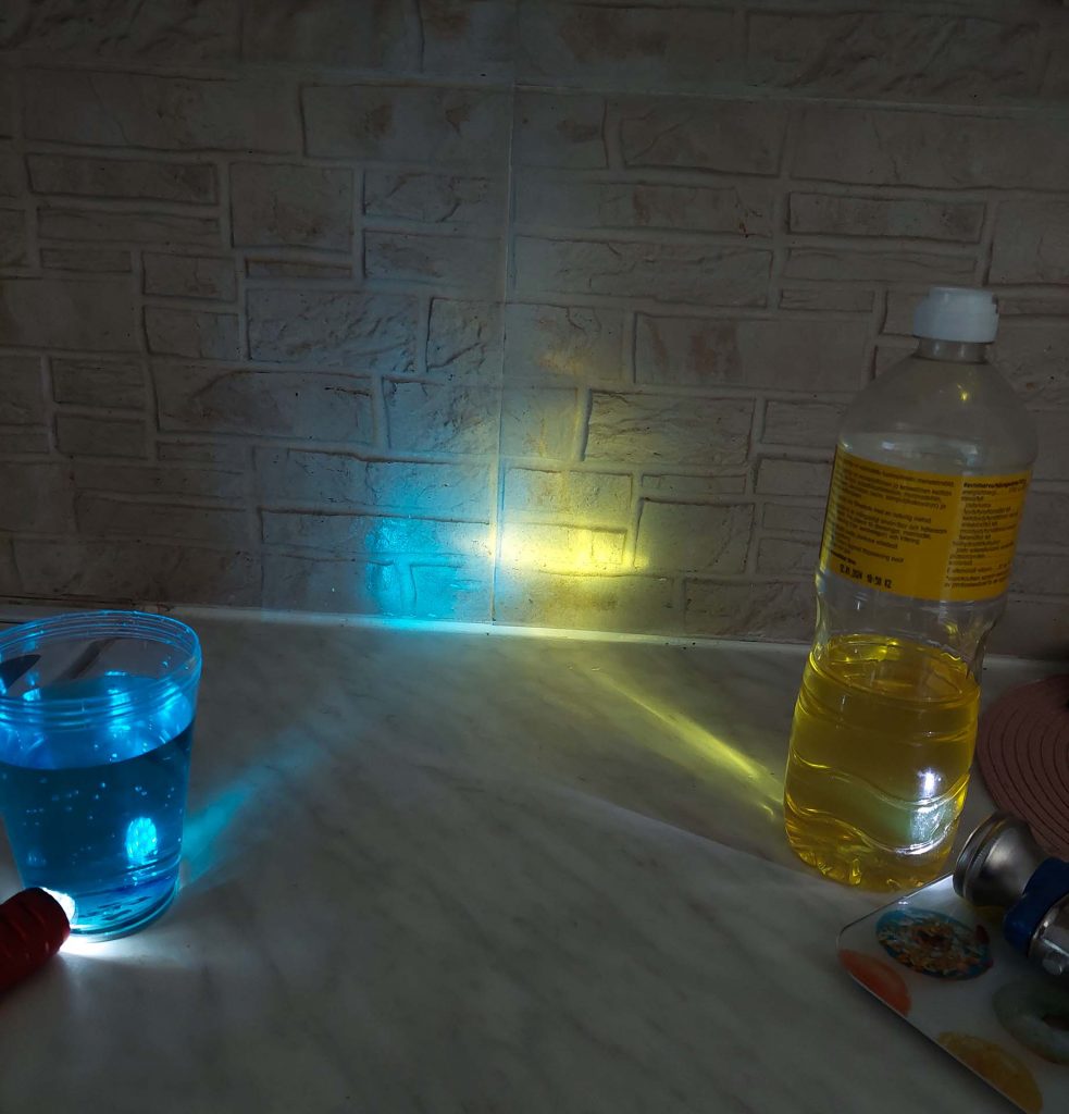 Kaksi taskulamppua ja puhelimen taskulamppu, raastin, värikkäitä nesteitä (esim. ja kaksi elintarvikeväreillä vesivärillä värjätty vesi kirkasta juomalasia, pilli, mahdollista rekvisiitta, kuvaamista varten puhelin tai kamera, jalusta mutta luovat ratkaisut sopivat myös mainiosti, esim. kirjapino.