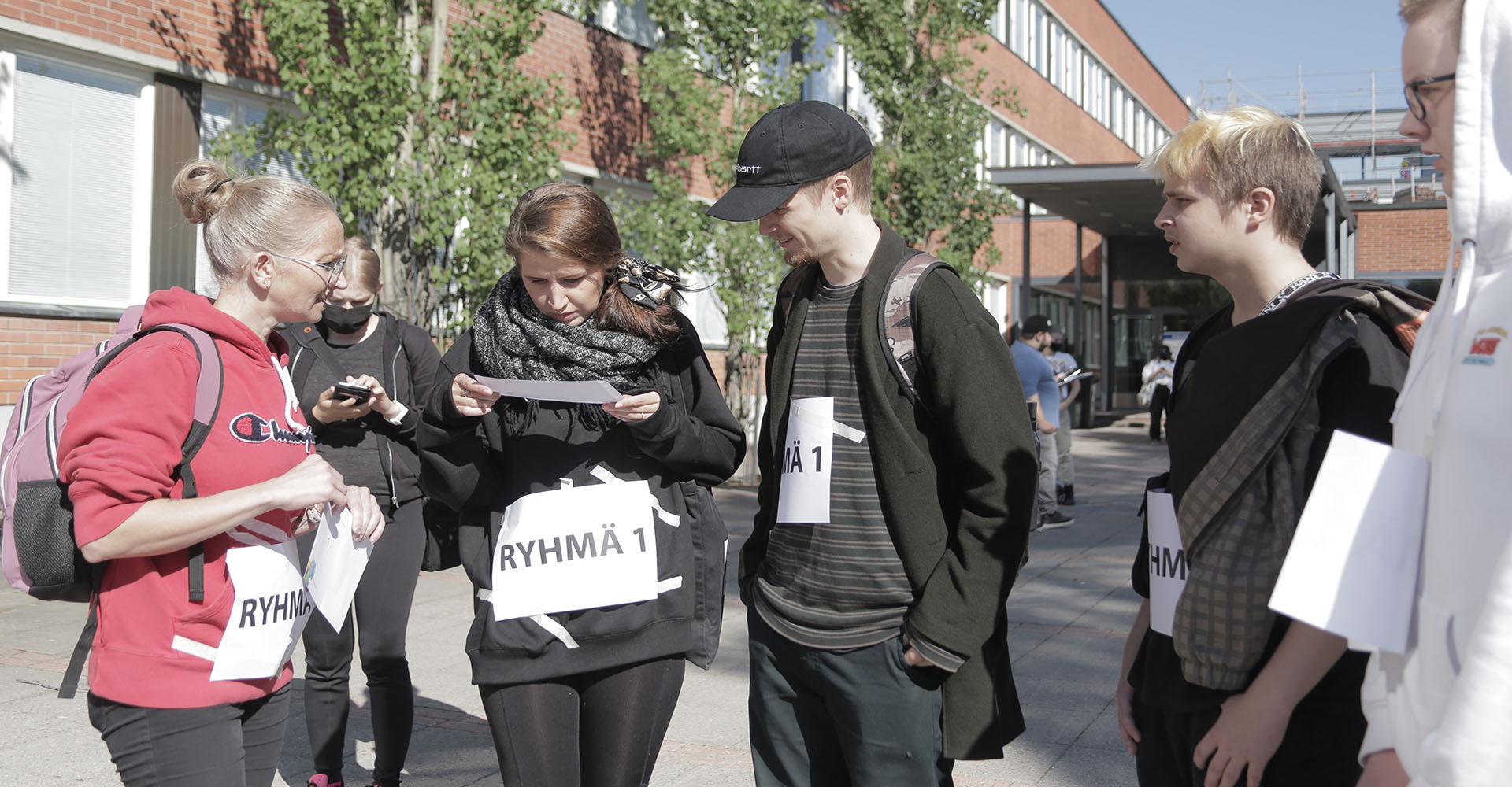 Uskomaton juoksu -tapahtuma aloitettiin jakamalla opiskelijat pienryhmiin. Pienryhmät kokoontuivat sovitusti koulun pihalla ja tunnelma oli odottava. Olimme kuvaajani kanssa sopineet, että lyöttäytyisimme jonkun ryhmän matkaan, joka olisi myös mahdollisimman avoin mukana olollemme. Sivusta seurattuna ykkösryhmä erottui muista ryhmistä ryhmän keskinäisellä hyvällä kommunikoinnilla. Iloinen porina erottui joukosta ja rohkenin kysyä sopisiko, että liittyisimme seuraan ja seuraisimme heidän kilpailun kulkua ja sehän sopi. Siten ryhmä ykkösen jäsenet valikoituivat meille tämän artikkelin päähenkilöiksi.
