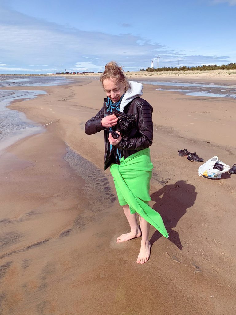 Aloimme käymään läpi one shot kuvausta ohjaajan ja näyttelijöiden kanssa paikan päällä. Kävimme fyysisesti läpi kaiken rannalla tapahtuvan, mutta kaikki vedessä tapahtuva tehtiin vain kerran, eli lopullisessa musiikkivideossa. Alunperin tarkoituksena oli yksinkertaisuudessaan kuvata kun Aino ja Venla kävelevät rannalta veteen, mutta Aino jatkaa matkaa syvemmälle yksin. Halusimme kuitenkin ohjaajan kanssa sisällyttää tanssia ja tunteiden vaihtelua, joten teimme pienen kierroksen rannalla ennen veteen menemistä. Kuvakulmissa täytyi huomioida valon suunta, ettei vääriä varjoja tulisi kuvaan. Meillä ei ollut vaihtovaatteita, joten kohtauksen pystyi ottamaan uudelleen ennen veteen menemistä, mutta kun vedessä oltiin niin se oli vietävä loppuun asti virheettömästi.
